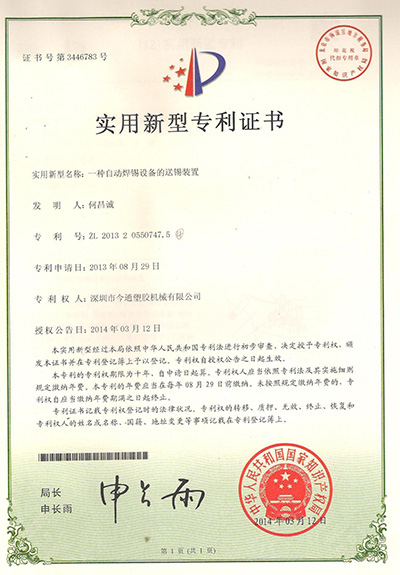 下一篇:下一篇:今通自動焊錫專利證書 上一篇:上一篇:焊接機外觀設(shè)計專利